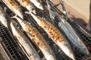 秋の魚、サンマの炭火焼きのようすを子どもたちに見てもらいました。生の状態から焼き上がるまで、ほんの数分間ですが脂が炭の上に落ちて音をたて煙が立ち上がるようすを目を丸くして見ていました。お箸を使って上手な食べ方も教えてもらったけど、みんなできたかな?