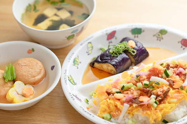 一汁三菜とは、昔から日本の食文化に根付いた「汁物1品+主菜1品+副菜2品」の組み合わせです。3Spoonでは、必要な栄養素がバランス良くとれるこの伝統的な食事スタイルを基本に、飽きのこないバラエティー豊富な献立作成と、真心のこもったおいしい給食作りに努めています。