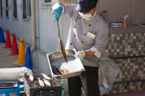 秋の魚、サンマの炭火焼きのようすを子どもたちに見てもらいました。生の状態から焼き上がるまで、ほんの数分間ですが脂が炭の上に落ちて音をたて煙が立ち上がるようすを目を丸くして見ていました。お箸を使って上手な食べ方も教えてもらったけど、みんなできたかな?
